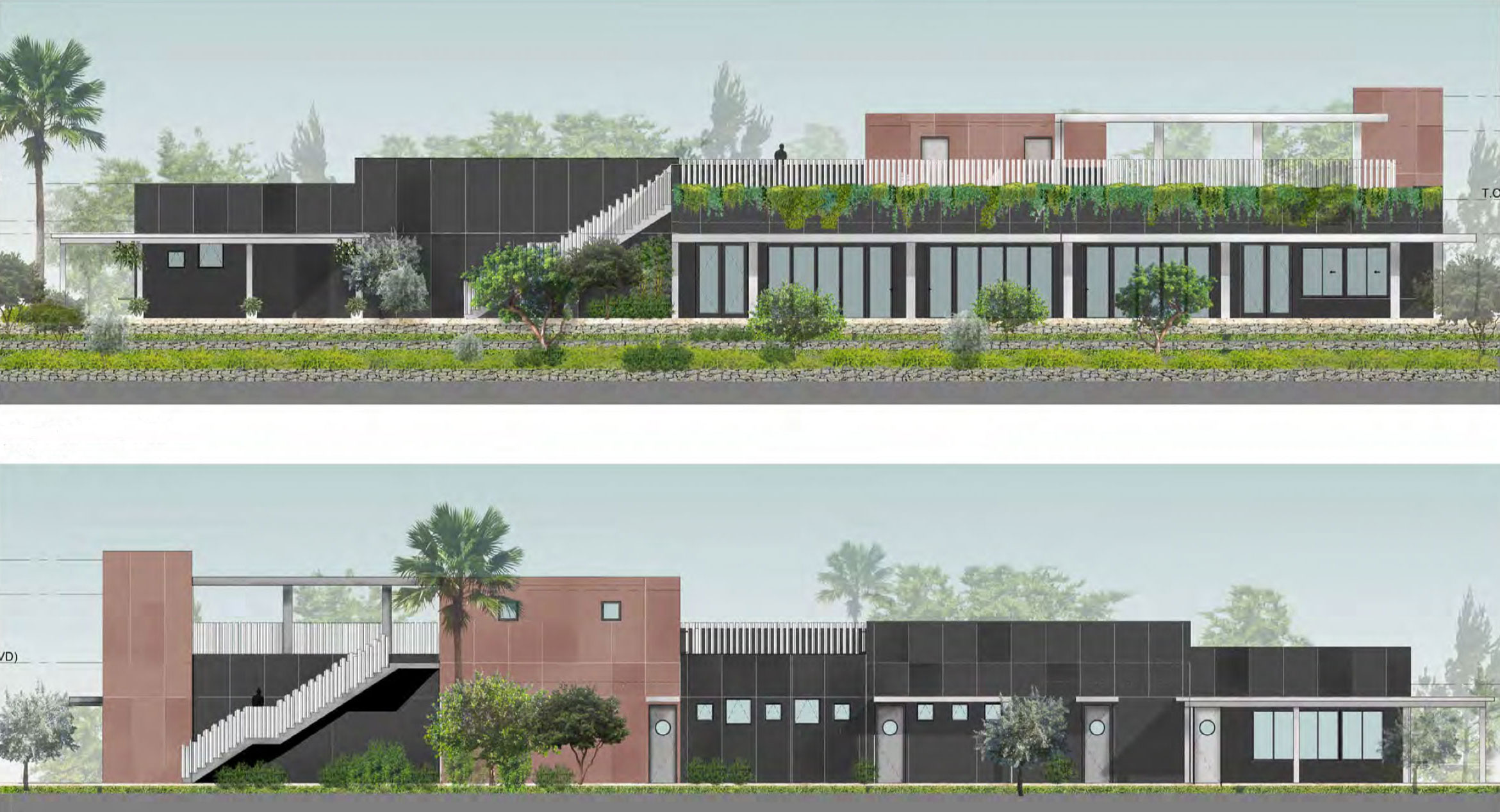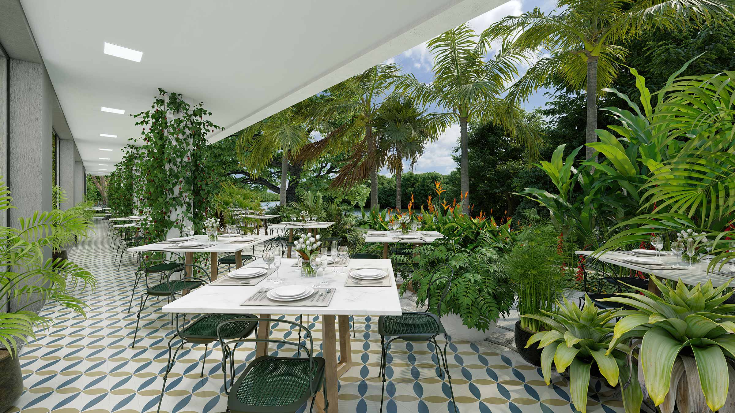 The River Food Garden has been designed to be minimalistic, green, and biophilic, with rich, lush landscaping.